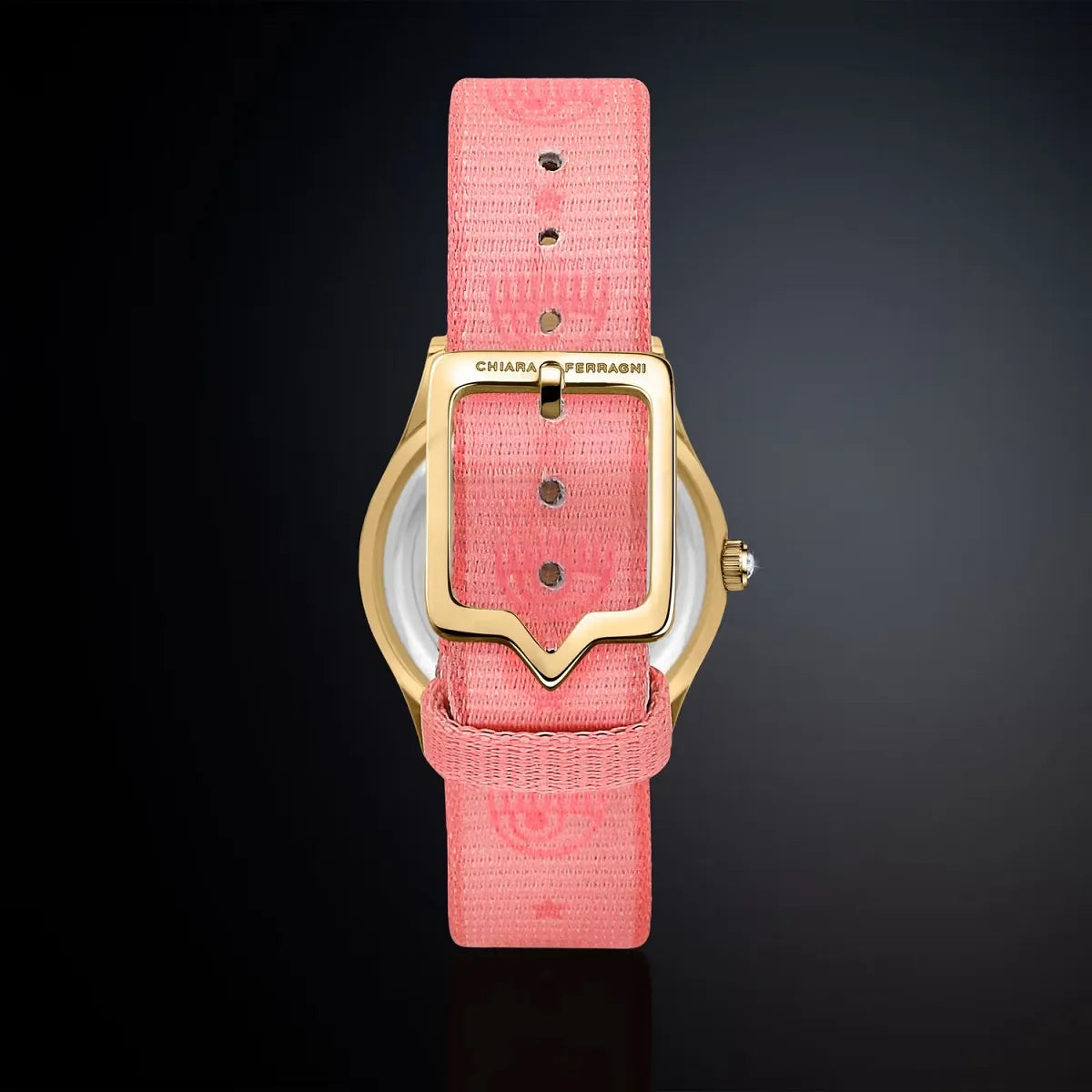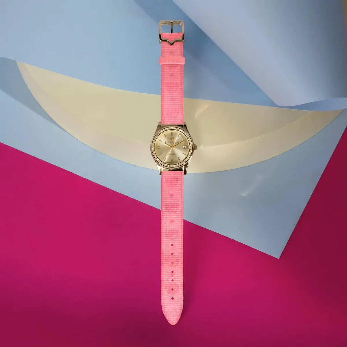 - Das Zifferblatt mit Datumsanzeige und das rosa Textilarmband mit Dornschließe bieten Komfort und Praktikabilität.